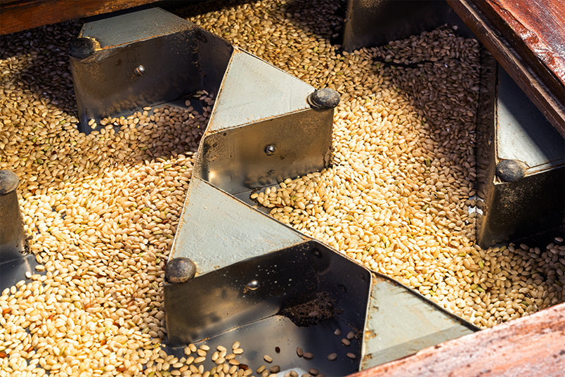 Inizialmente, i chicchi passano attraverso macchinari che, oscillando, rimuovono la lolla esterna.